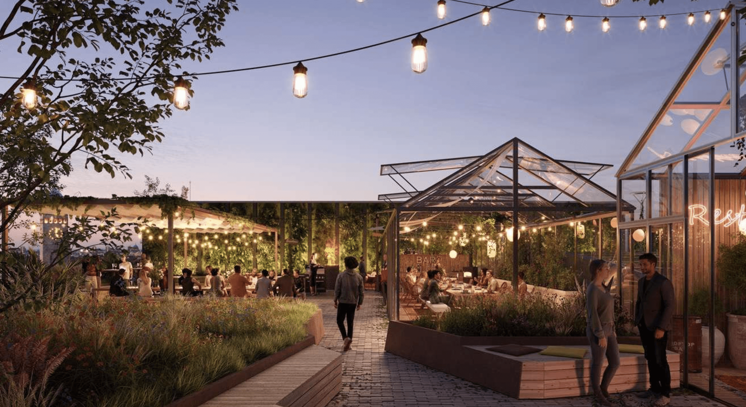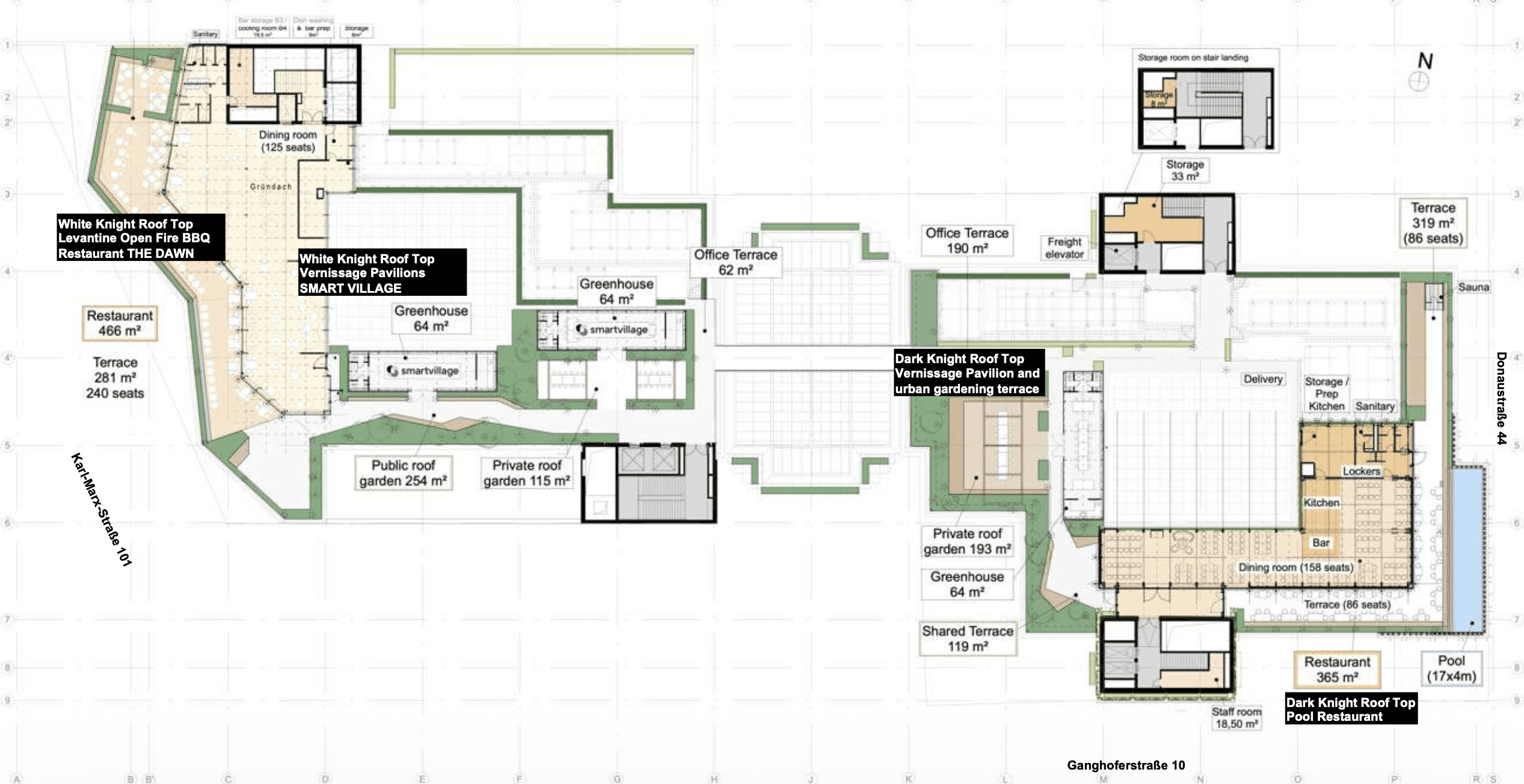 Ein weiterer Bestandteil ist ein Pavillon mit ca. 64 m², der flexibel für Bar-, Event- oder Lounge-Nutzungen eingesetzt werden kann. Abgerundet wird das Angebot durch einen privaten Roof Garden mit ca. 193 m², der als grüne Rückzugsfläche oder exklusiver Aufenthaltsbereich genutzt werden kann.