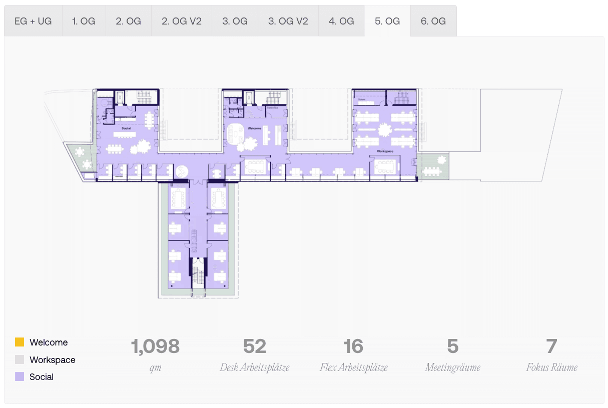 Moderne, flexibel nutzbare Coworking-Unit im 5. Obergeschoss der Wallstraße 16 in zentraler Lage Berlin-Mitte. Auf 1.098 m² bietet die T-förmige Raumplanung einen zentralen Empfangsbereich (Welcome), großzügige Workspace-Zonen, ausgeprägte Social-/Community-Bereiche sowie zwei kleine Terrassen an den äußeren Flügeln. Die Ausstattung umfasst 52 feste Desk-Arbeitsplätze, 16 Flex-Arbeitsplätze, 5 Meetingräume, 7 Fokus-Räume sowie Backoffice- und Serverflächen – ideal für hybride Arbeitskonzepte und effiziente Teamorganisation. Das sorgfältig restaurierte Loftgebäude verbindet historischen Charakter mit zeitgemäßem Design; die Lage punktet mit ausgezeichneter ÖPNV-Anbindung, hoher Gastronomie-Dichte und Nähe zu Spittelmarkt, Alexanderplatz und Museumsinsel. Geeignet für Start-ups, Agenturen, Kreativ- und Projektteams, die eine flexible, repräsentative und zentral gelegene Arbeitsumgebung suchen.