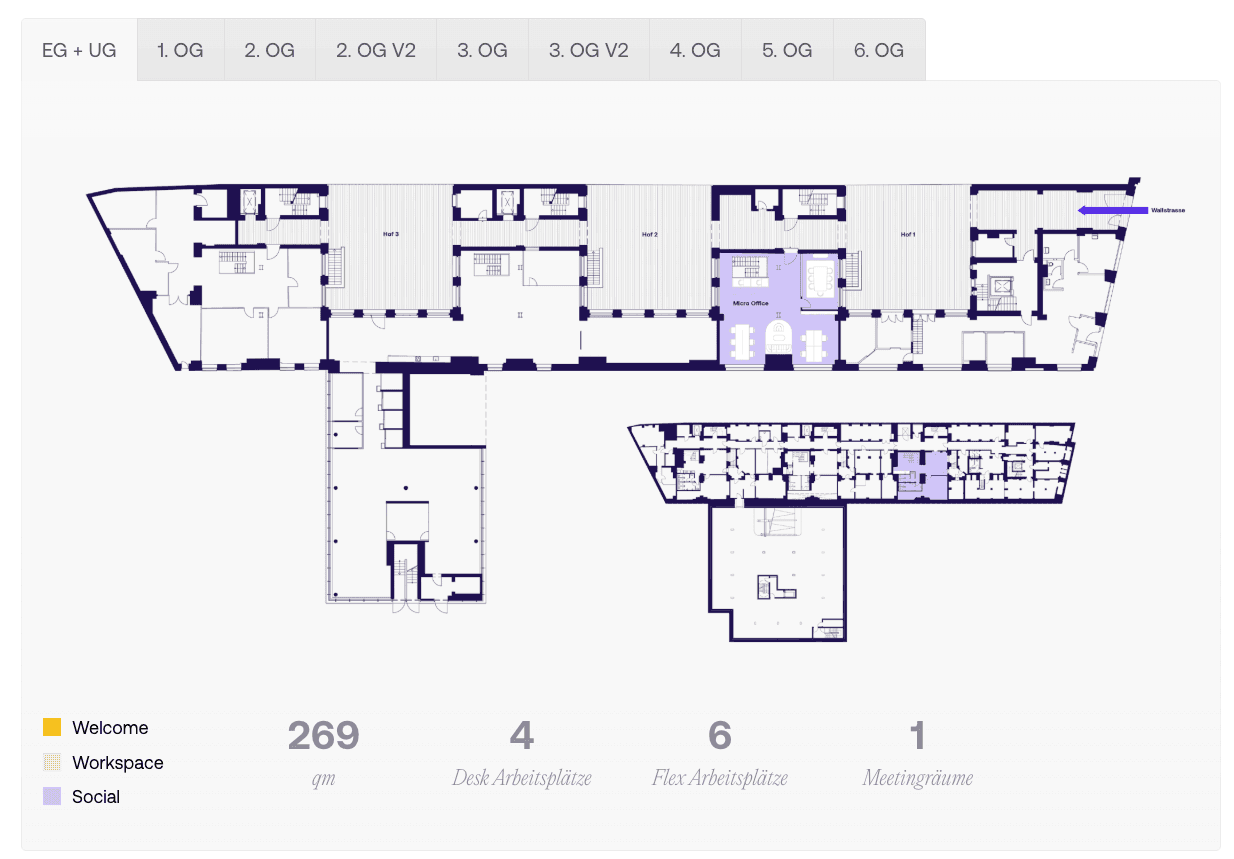 Die Raumaufteilung unterstützt flexible Workflows: Empfangsbereich, offene Arbeitsflächen, Social‑Zones und abgeschirmte Micro‑Offices schaffen Begegnungsflächen und Rückzugsmöglichkeiten zugleich. Perfekt für Unternehmen, die ein repräsentatives, zugleich adaptives Arbeitsumfeld in zentraler Innenstadtlage suchen.