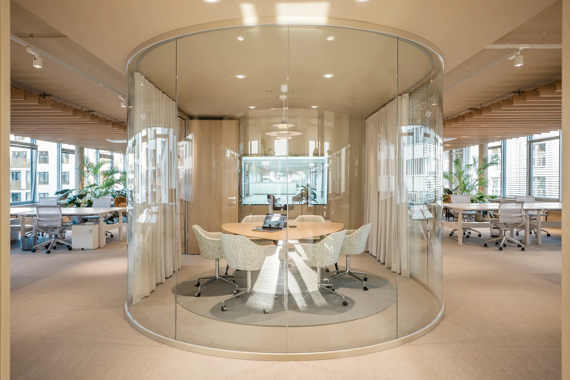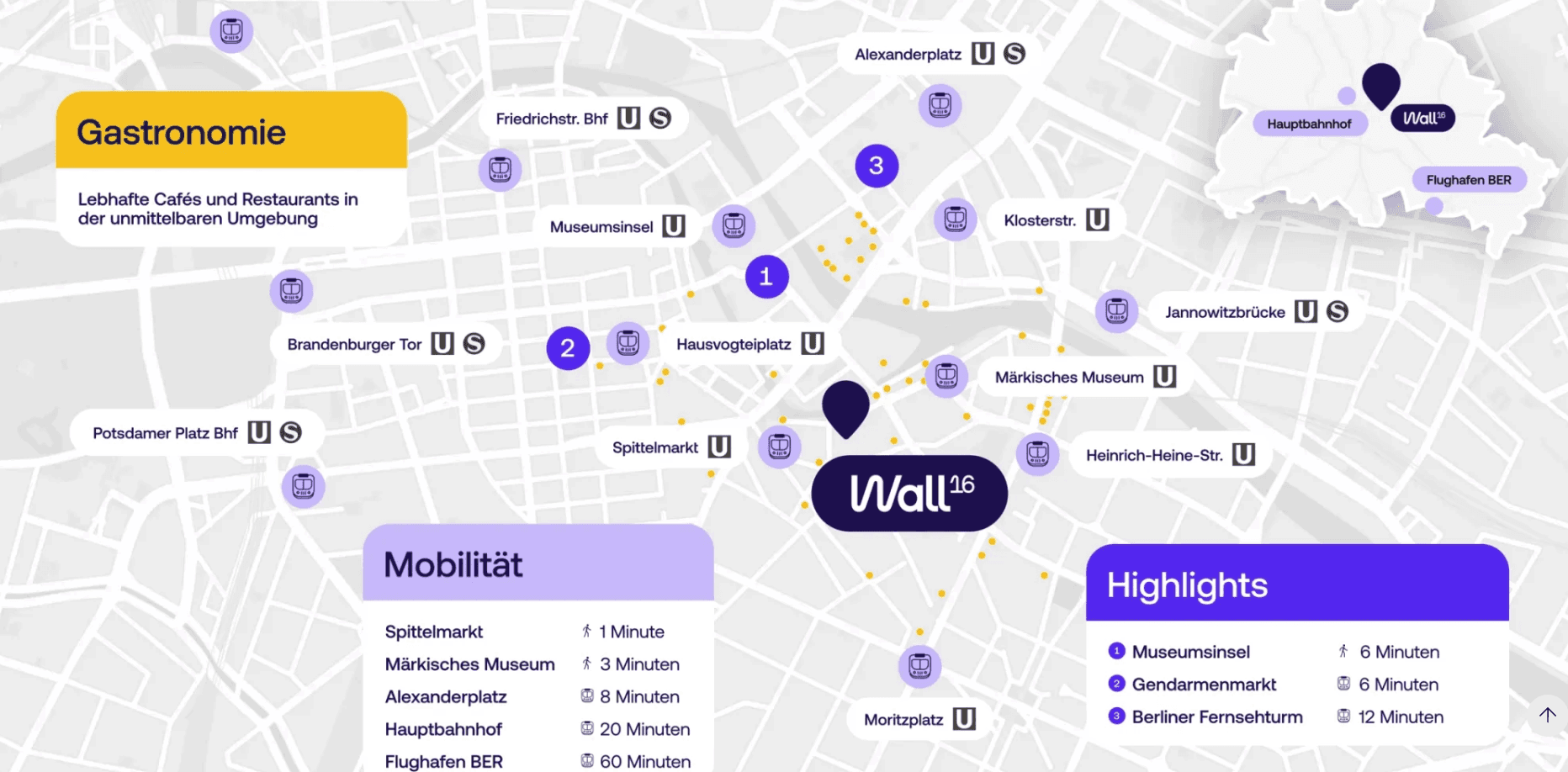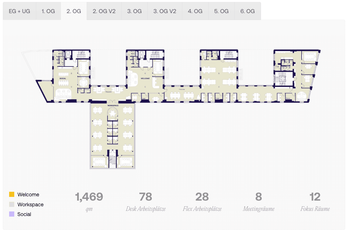 2. Obergeschoss, Wallstraße 16, 10179 Berlin‑Mitte — 1.469 m² modernes Büro‑/Coworking‑Layout. Die zonierte Etage verbindet einen zentralen Welcome‑Empfang mit seitlichen Workspace‑Flügeln und vorgelagerten Social‑Bereichen, ideal für kollaboratives Arbeiten und informellen Austausch. Mit 78 festen Desk‑Plätzen, 28 Flex‑Arbeitsplätzen, 8 Meetingräumen und 12 Fokusräumen bietet die Fläche eine ausgewogene Mischung aus Team‑ und Rückzugszonen sowie praktischen Nebenräumen (Lager, Server, Archiv). Der historische Loftcharakter des Gebäudes, hohe Raumwirkung und flexible Grundrisstypen schaffen eine attraktive Arbeitsumgebung für hybride Teams, Agenturen, Start‑ups und Unternehmen, die flexible Arbeitsplatzkonzepte mit klaren Fokus‑ und Meetingzonen verbinden möchten. Zentrale Lage in Berlin‑Mitte mit sehr guter Anbindung sowie zahlreicher Gastronomie und Services in unmittelbarer Umgebung rundet das Angebot ab.